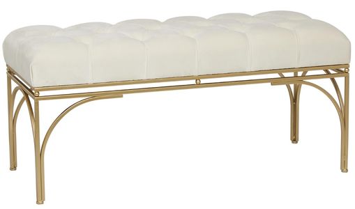 Indulge in the glamorous luxury of plush textures, dazzling details, and sleek finishes to elevate your home and add a sophisticated flair. This white home bench is crafted with a comfortable velvet cushioned seat and a robust metal base with an MDF foundation. Featuring a white cushioned seat and satin gold metal frame, this rectangle entryway room bench exudes elegance. This metal bench features a rectangular body structure with a button-cushioned velvet seat and four sturdy metal legs with a stunning arched bar design.